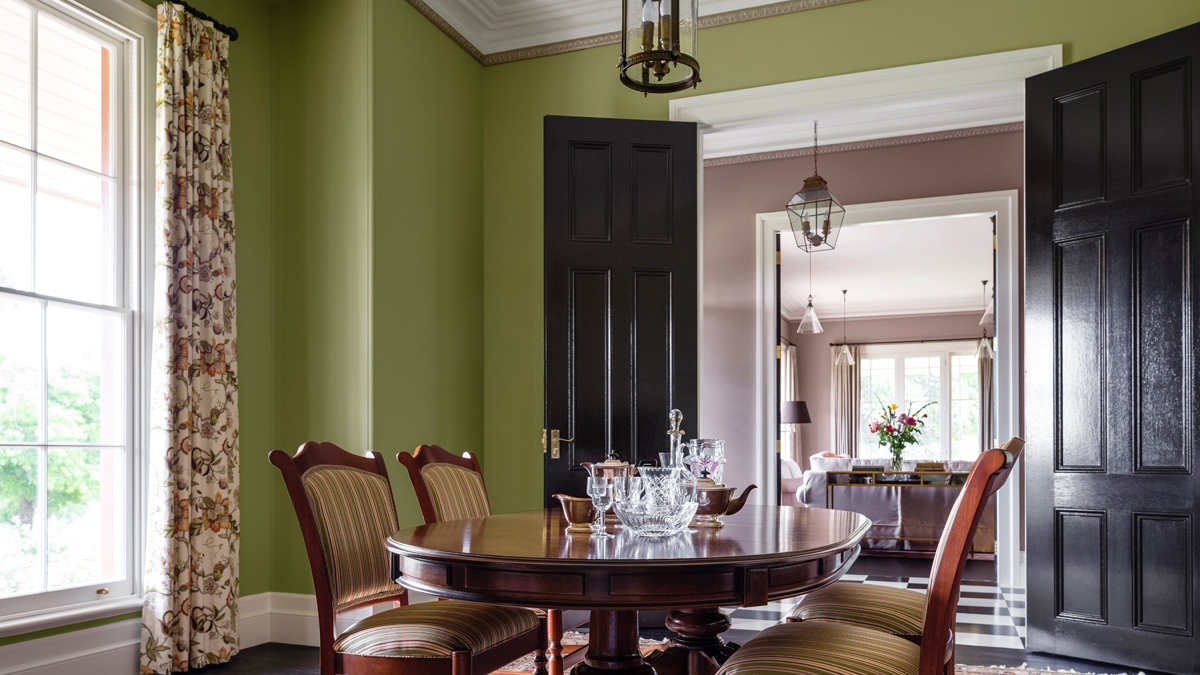 The dining room was painted with Porter’s Eggshell Acrylic in Calm Green for a richly coloured designer matte finish.