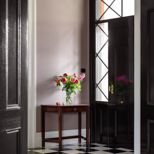 Porter's Eggshell Acrylic is used throughout the house, the very low sheen level is an elegant contrast to the high gloss of the doors and trim areas.