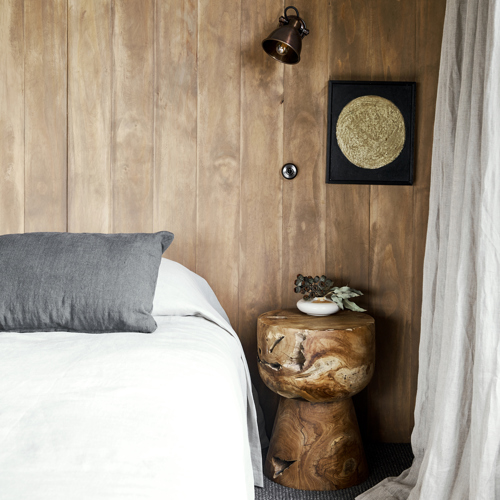 Porter's Wood Wash was created in a bespoke colour especially for this project, to emphasise the organic shapes and variation in the timber clad walls, whilst deepening its colour and warming the room. The result is a cosy and restful space that still retains a freshness through crisp linens and abundant natural light.