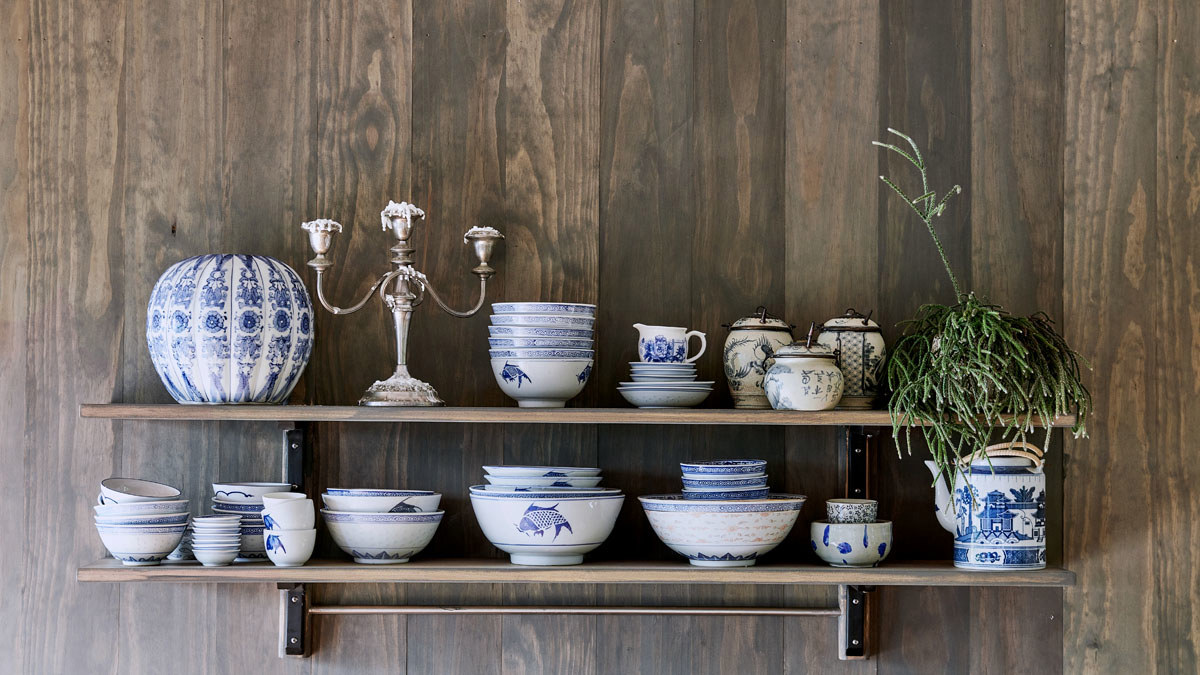 Genine artfully placed her collection of blue and white glazed pottery against the warm custom-made brown-grey of Wood Wash walls, creating a beautifully curated moment of contrasting colour.