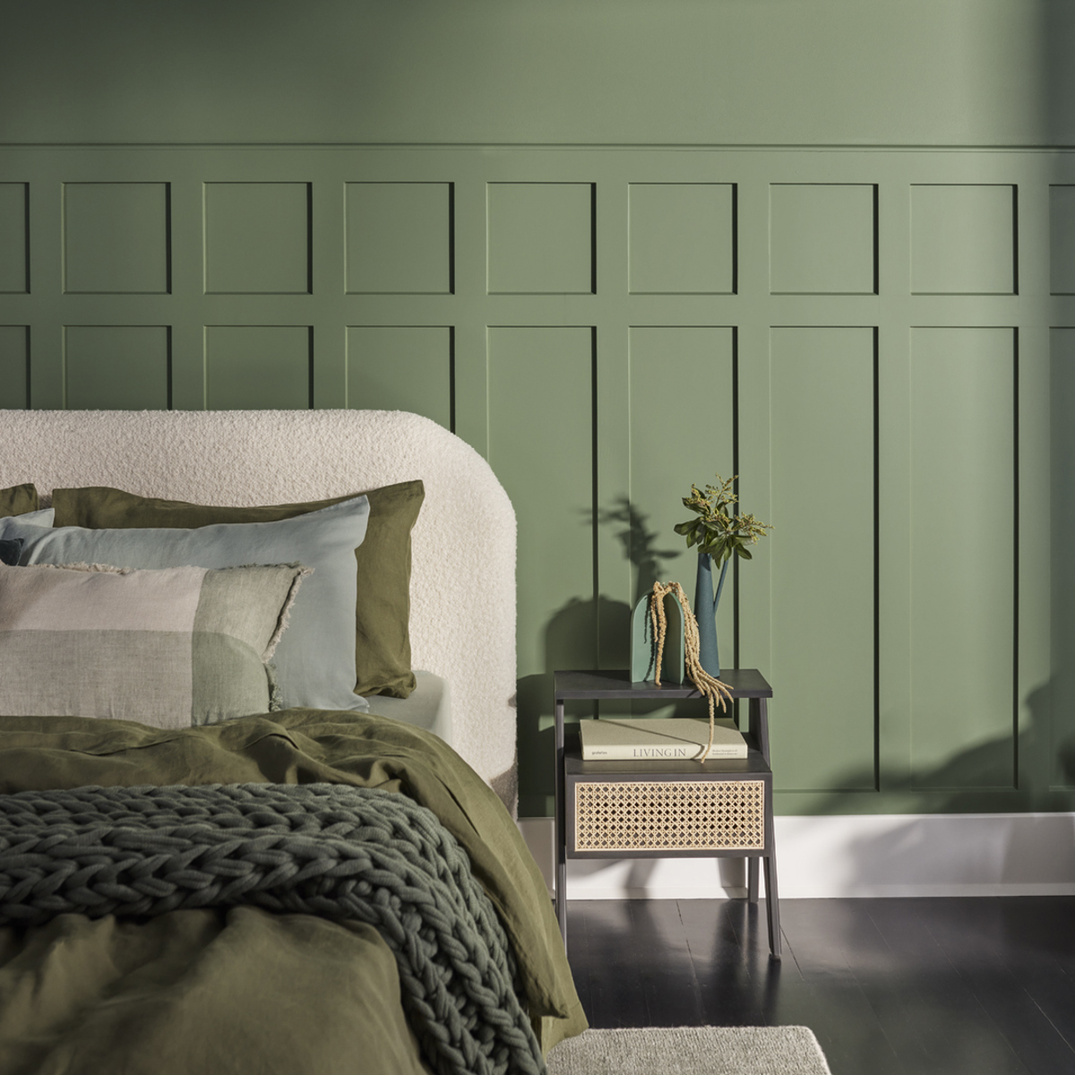 Muted greens, from complicated olive, complex green grey and neutrals with subtle green undertones, all create an elegant, calm atmosphere.