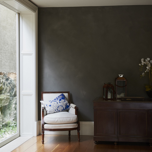 When your outlook is world class and heavy with history, how does one design an interior to harmonise? Amy chose to use the historically inspired Interior Distemper in rich, deep "Ristretto", brushed by hand for a chalky aged finish that is at once stately and timeless. The depth of colour serves as the perfect backdrop to a unique collection of precious objects collected during travels abroad, and emphasises the warm timber tones throughout. Perhaps the best trick however is the way the deep matte finish draws the eye outwards to the garden and natural beauty beyond.