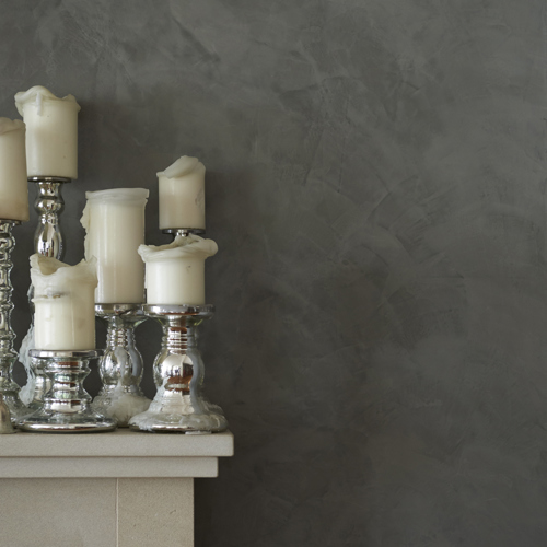 Fresco in Shell Grey was applied to the fireplace surround by Rebecca from Set For Art for a luxurious handmade finish that is as tactile as it is beautiful. Rebecca used a traditional trowel technique then waxed and polished the finish until it gleamed, highlighting the unique movement and colour variation this finish offers. Pictured here forming a backdrop to these romantically aged silver candlesticks.